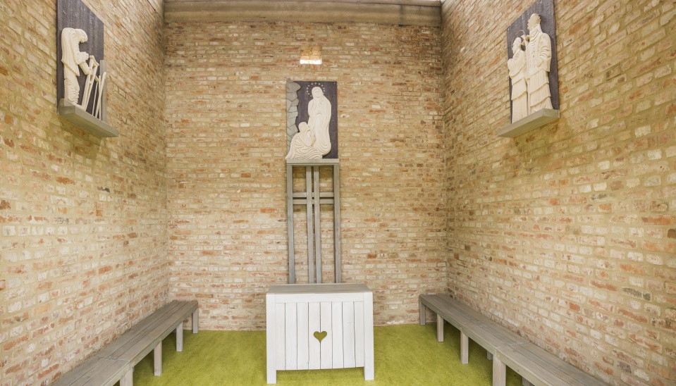 Kaplnka tvorí architektonický celok s námestím a kúriou Kosztics - Hroššo na pôvodnom mieste, kde bola aj kaplnka z 19.stročia. Objekt má jednoduchý štvorcový pôdorys, steny svojou hrúbkou pôsobia stabilne, smerom k oblohe sa postupne otvára. V strede interiéru je umiestnený oltár, pri stenách sú lavice, na stenách sú umiestnené drevené reliéfy od regionálneho rezbára / Lourdská panna Mária s Bernadette, IX.Pius, II.Ján Pavol /. Podlaha so svojou sviežou farebnosťou oživuje priestor, steny sú z režného muriva. Na streche bola použitá prírodná bridlica. Priestor pred kaplnkou tvorí mobiliár /lavice, informačná tabula/, stromy a dlažba vstupný priestor je vytvorená z vybúraných tehál. Kaplnka bola vysvätená v septembri roku 2014.